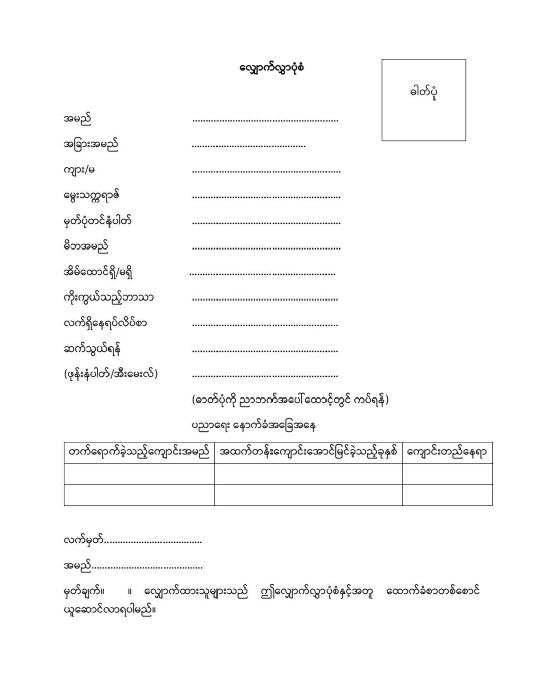 ‼️ပြည့်စုံစွာဖြည့်စွက်မထားသော လျှောက်လွှာဖောင်များကို ထည့်သွင်းစဉ်းစားသွားမှာမဟုတ်တဲ့အတွက် သေချာ ပြည့်စုံစွာ ဖြည့်ကြရန် တိုက်တွန်းပါသည်။