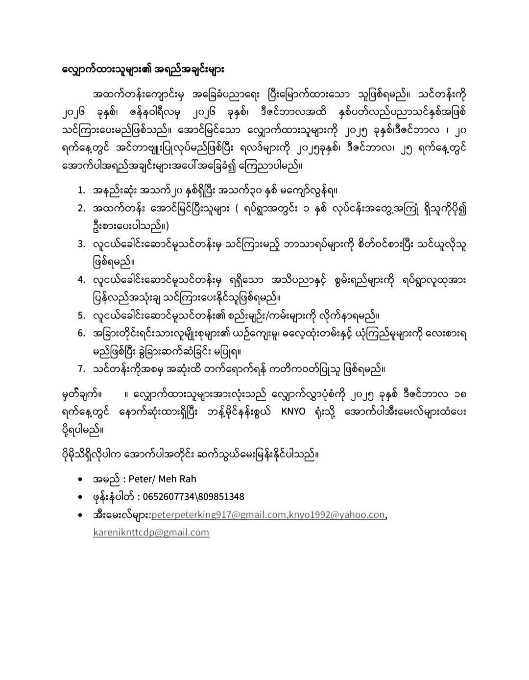 ကရင်နီပြည်လူငယ်အင်အားစုမှ ဦးစီးပြီး ကရင်နီပြည်လူငယ်နိုင်ငံရေးနှင့်အုပ်ချုပ်ရေး ခေါင်းဆောင်မှုစွမ်းရည်မြှင့်သင်တန်းတစ်ရပ်ပြုလုပ်သွားမည်ဖြစ်ပါသောကြောင့် စိတ်ပါဝင်စားသူများမည်သူမဆို ပါဝင်လျှောက်ထားနိုပါသည်။